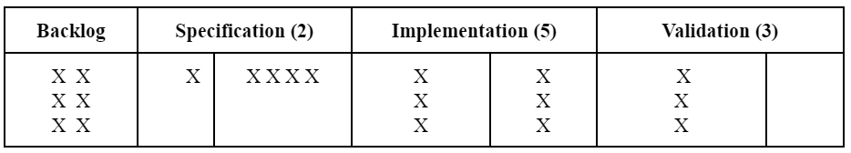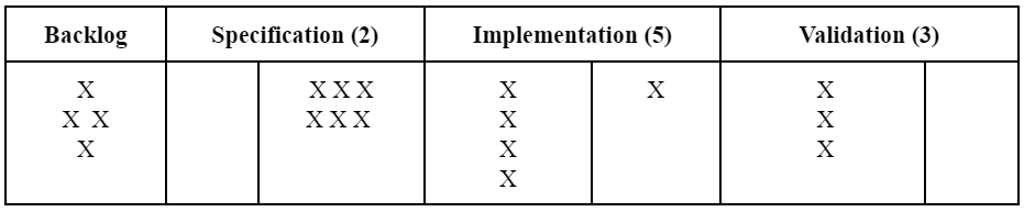 We will now explain the concept of Work in Progress for the Specification step. To compute the WIP for this step, we need to sum up the stories in Specification (which is zero in our previous example) with the stories that have already been specified. For example, in the previous board, we’ve specified two stories: tasks T8 and T9 are products of the same story’s specification, while tasks T10, T11, and T12 resulted from the specification of another story. Therefore, in this step, for the purpose of WIP computation, we have two stories, which is equal to the limit of 2. To ease visualization, we display the tasks emerging from the same story specification on a single line. Hence, to compute the WIP of the Specification step, we should add the number of stories in the first subcolumn (zero in our case) to the number of lines in the second subcolumn (two in this case).